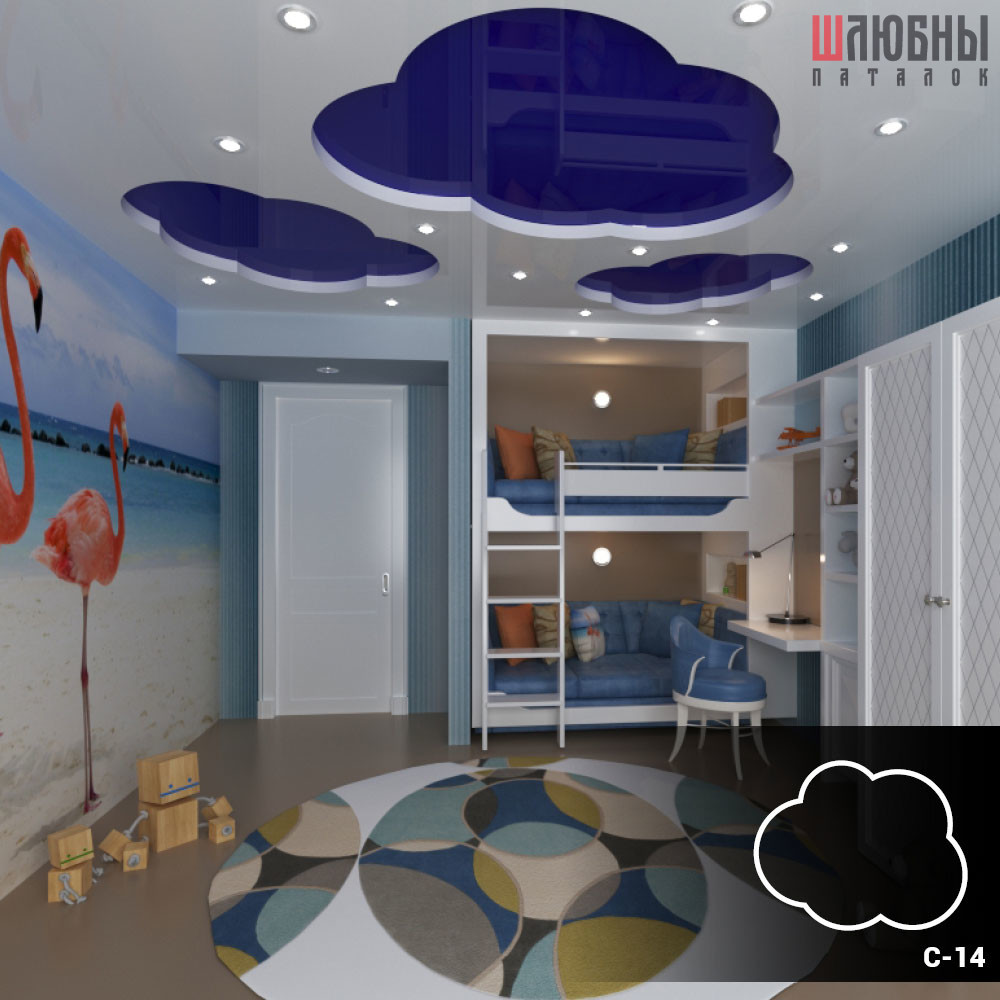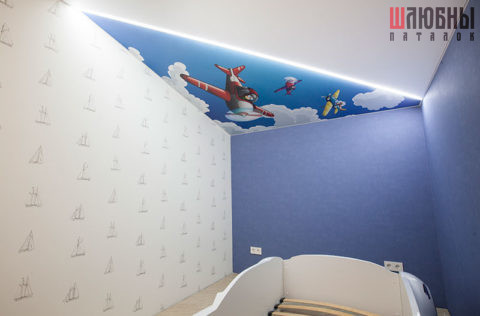 Комбинированный натяжной потолок, сочетающий одноуровневое матовое полотно – для основной части комнаты, парящую линию – для подсветки спальной зоны, и красочный фотопотолок. Выбранное ребенком изображение, нанесенное на сатиновое полотно, позволяет разнообразить интерьер детской.