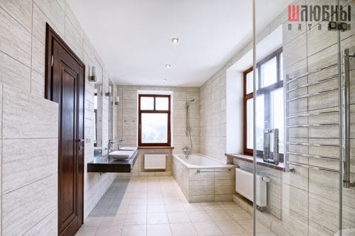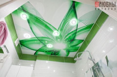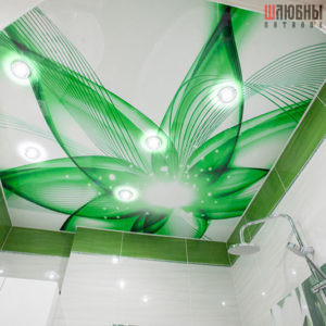 Натяжной потолок с изображением цветочной тематики на глянцевом полотне. Оттенки фотопечати гармонично дополняют дизайн керамической плитки в ванной комнате, обеспечивают ощущение свежести в ней. Для освещения выбраны встроенные потолочные светодиодные светильники с эффектом рассеивания света.