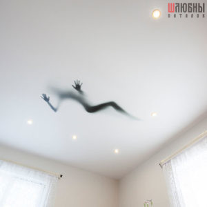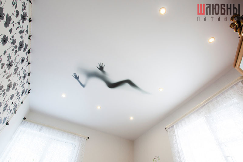 Собственная разработка – потолок с меняющимся изображением. Этот потолок-хамелеон благодаря специальной встроенной подсветке буквально по щелчку выключателя преображается до неузнаваемости: на спокойном однотонном полотне проявляется оригинальный сюжет.